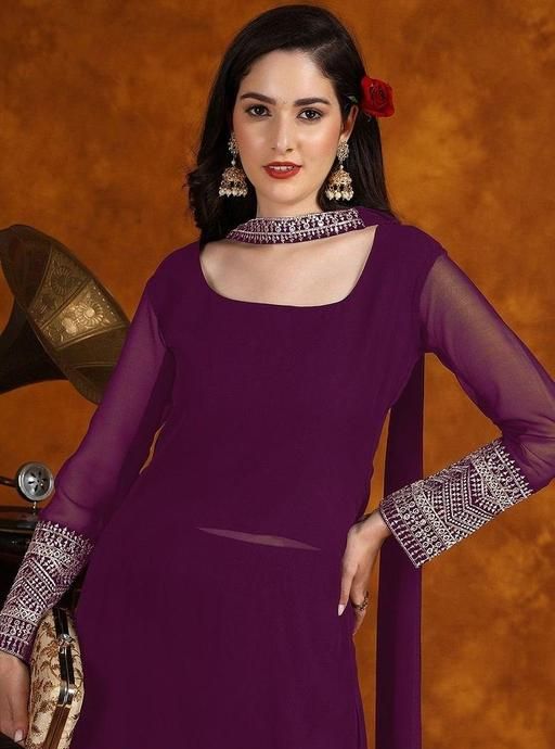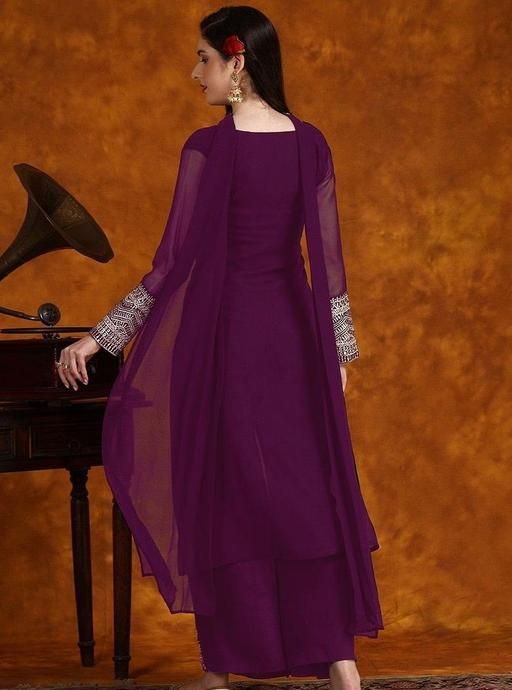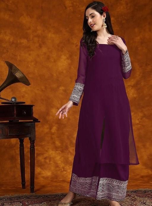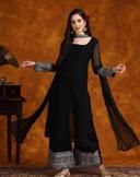 Name : Women Zari Lace Work Georgette Kurta With Palazzo And Dupatta Set