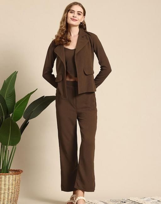 Name: Gunvi trendz Women Business Suits Shawl Lapel Office Work Pantsuits 3 Piece Set Top Fabric: Polyester Bottom Fabric: Polyester Sleeve Length: Long Sleeves Net Quantity (N): 1 Sizes: S (Top Bust Size: 34 in, Top Length Size: 24 in, Top Hip Size: 32 in, Bottom Waist Size: 34 in, Bottom Hip Size: 28 in, Bottom Length Size: 38 in) M (Top Bust Size: 36 in, Top Length Size: 24 in, Top Hip Size: 34 in, Bottom Waist Size: 36 in, Bottom Hip Size: 30 in, Bottom Length Size: 38 in) L (Top Bust Size: 38 in, Top Length Size: 25 in, Top Hip Size: 36 in, Bottom Waist Size: 38 in, Bottom Hip Size: 32 in, Bottom Length Size: 39 in) XL (Top Bust Size: 40 in, Top Length Size: 25 in, Top Hip Size: 38 in, Bottom Waist Size: 40 in, Bottom Hip Size: 34 in, Bottom Length Size: 39 in) XXL (Top Bust Size: 42 in, Top Length Size: 25 in, Top Hip Size: 40 in, Bottom Waist Size: 42 in, Bottom Hip Size: 36 in, Bottom Length Size: 39 in) Lycra Fabric this 3 piece co-ord Blazer, Inner Top and Pant set comes with a single breasted cropped blazer which has a sttandard notch collar and high waisted pants, Perfect for your Casual wear and can be layered and worn with anythin,this Casual blazer, Procent is a modern women's fashion brand . This ellegant Blazer is especially designed for the women who are entering or have already entered the corporate world. Country of Origin: India
