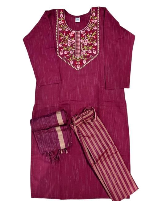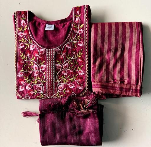 The classic zari work kurta comes paired with trousers and a matching dupatta, all in a fully stitched, ready-to-wear design