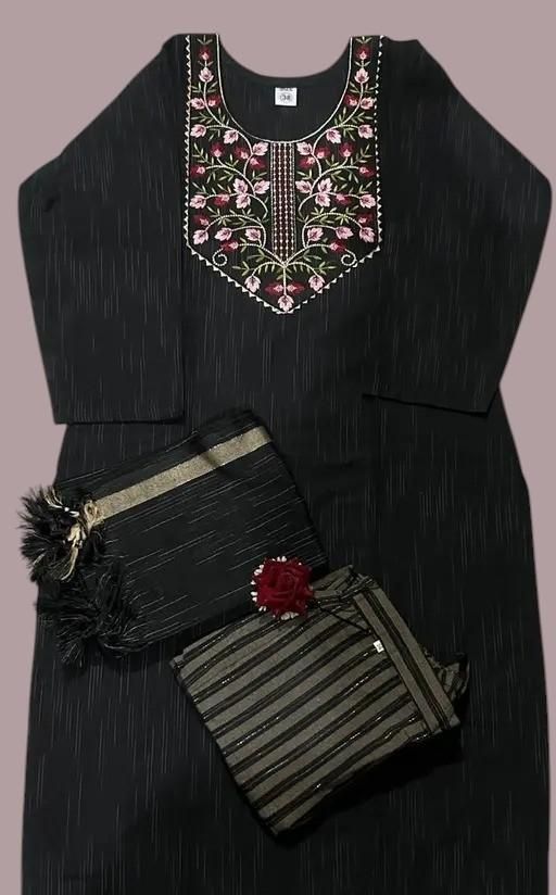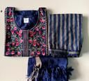 The classic zari work kurta comes paired with trousers and a matching dupatta, all in a fully stitched, ready-to-wear design