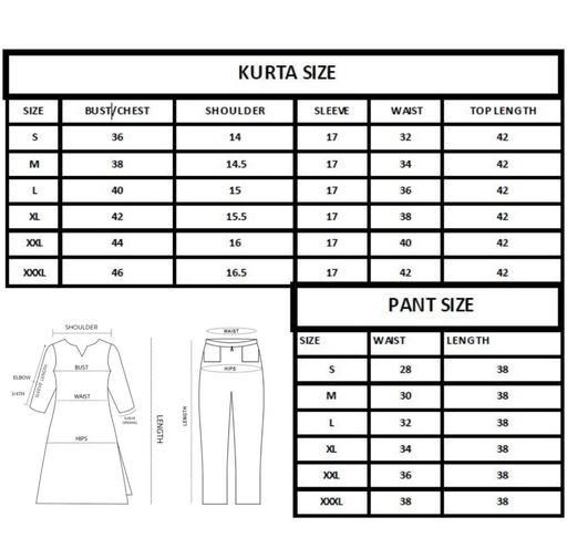 S (Bust Size: 36 in, Shoulder Size: 14 in, Kurta Waist Size: 32 in, Kurta Length Size: 42 in, Bottom Waist Size: 34 in, Bottom Length Size: 37 in)