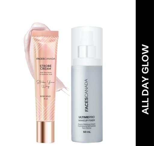 All Day Glow Combo - Strobe Cream - Rose Gold (18ml) + Ultime Pro Makeup Fixer (50ml) | Illuminating & Glowing Makeup Base | Long Lasting Makeup Setting Spray