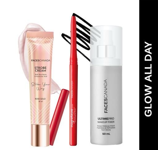 Product Name: FACES CANADA Glow All Day Combo - Strobe Cream - Rose Gold (18ml) + Magneteyes Kajal - Black (0.35g) + Ultime Pro Makeup Fixer (50ml) | Long Lasting & Glowy Makeup | Waterproof & Smudgeproof