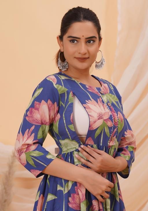 Name: "Feeding Kurti" Woman's Rayon Floral Printed Anarkali Maternity Feeding kurti (Off White/Black)
