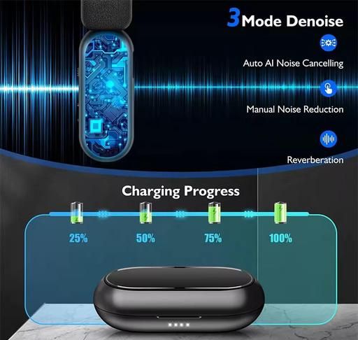 800mAh Large Capacity Charging Case :: Built in 800mAh Li-on battery, the charging case can charge microphone at least 7 times in emergency. And upgrade to the new way of charging with the USB-C connector.