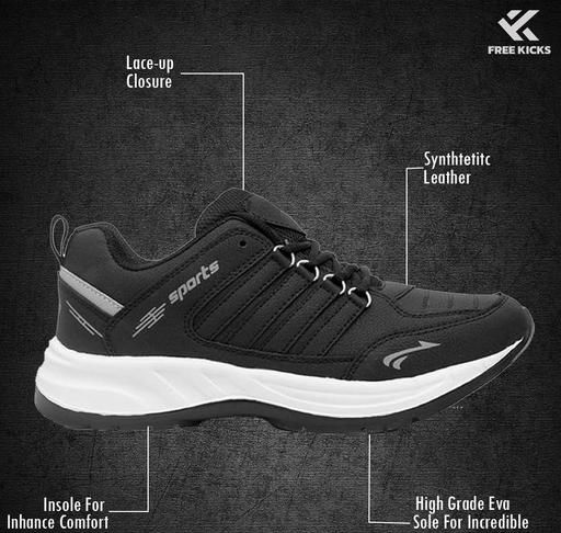 FREE KICKS Men's Black Sports Shoes are the best combination of style, affordability, and daily performance, step into comfort. These sports wear sneakers are perfect for casual use, gym exercises, running, and walking. The lightweight EVA sole provides good traction and cushioning for everyday usage, the breathable mesh top keeps your feet cool and comfy throughout the day. Black color goes well with jeans, joggers, and shorts, giving a smart and athletic style in affordable prices.