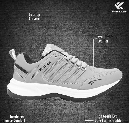 FREE KICKS Men's Grey Sports Shoes are the best combination of style, affordability, and daily performance, step into comfort. These sports wear sneakers are perfect for casual use, gym exercises, running, and walking. The lightweight EVA sole provides good traction and cushioning for everyday usage, the breathable mesh top keeps your feet cool and comfy throughout the day. Grey color goes well with jeans, joggers, and shorts, giving a smart and athletic style in affordable prices.