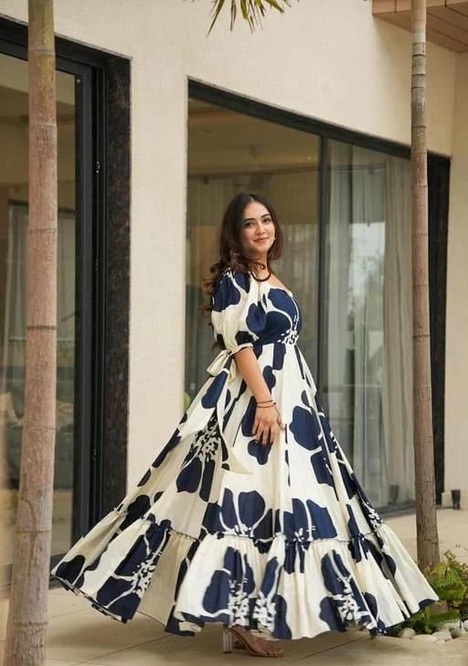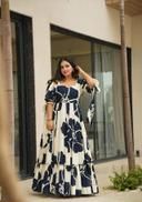 Elevate your style full-flare white gown Reyon fabric. Designed elegance, soft, lightweight Girl's dress Navy Floral Flare Maxi Dress with Puff Sleeves Stylish modern floral Gowns || Daily wear Gown || Designer Gown || Stylish Gown || Daily use Gown || Office use Gown || Latest Gown
