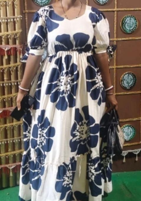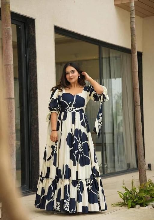 Name: Elevate your style full-flare white gown Reyon fabric. Designed elegance, soft, lightweight Girl's dress Navy Floral Flare Maxi Dress with Puff Sleeves Stylish modern floral Gowns || Daily wear Gown || Designer Gown || Stylish Gown || Daily use Gown || Office use Gown || Latest Gown