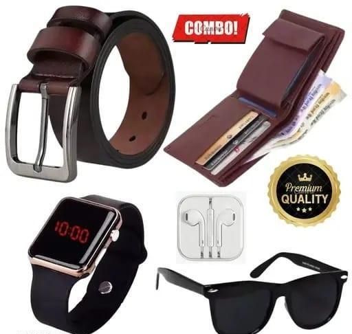 Name: Mens Trendy premium combo - Genuine leather belt , brown wallet , wired earphones , black uv sunglasses and premium digital watch