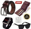 Mens Trendy premium combo - Genuine leather belt , brown wallet , wired earphones , black uv sunglasses and premium digital watch