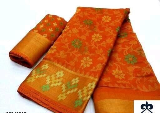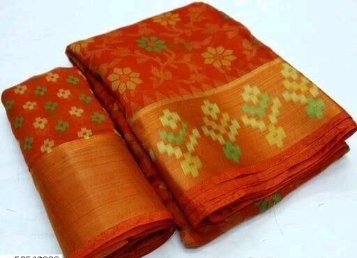 Name: Brasso printed pure cotton Blend Orange Brocade saree with blouse with pallu Saree Fabric: Art Silk Blouse: Running Blouse Blouse Fabric: Cotton Linen Pattern: Zari Woven Blouse Pattern: Printed Net Quantity (N): Single Having Brasso Print, Floral Print, Printed on Pure Cotton Fabric With Printed Unstitched Blouse Piece. This Bollywood type Saree Have Geometric, Floral, Botanical Prints Pattern On Cotton Fabric Looks Pretty Awesome For Casual, Party, Festive & Wedding Occasion. Sizes: Free Size (Saree Length Size: 5.2 m, Blouse Length Size: 0.8 m) Country of Origin: India