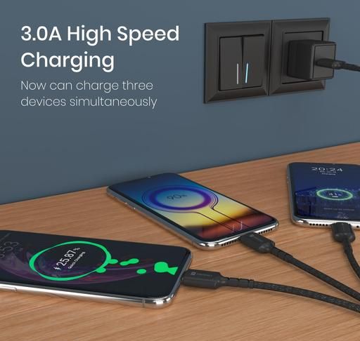 Konnect A Trio 3-in-1 Charging Cable is here to simplify your lifestyle by providing versatile phone charging solutions to buyers. It is widely compatible with micro USB, iOS, and Type Adding to your delight, This wire has been designed to avoid the hassles of carrying 3-4 charging cables together for every device. Konnect A Trio is equipped with 3.0A Fast Charging that can charge your device 50% in just 30 minutes. It ensures maximum protection to your expensive electronic gadgets while charging. The 1.5M cable is nylon-braided that enhances its durability and has a lifespan of 10000+ bents.